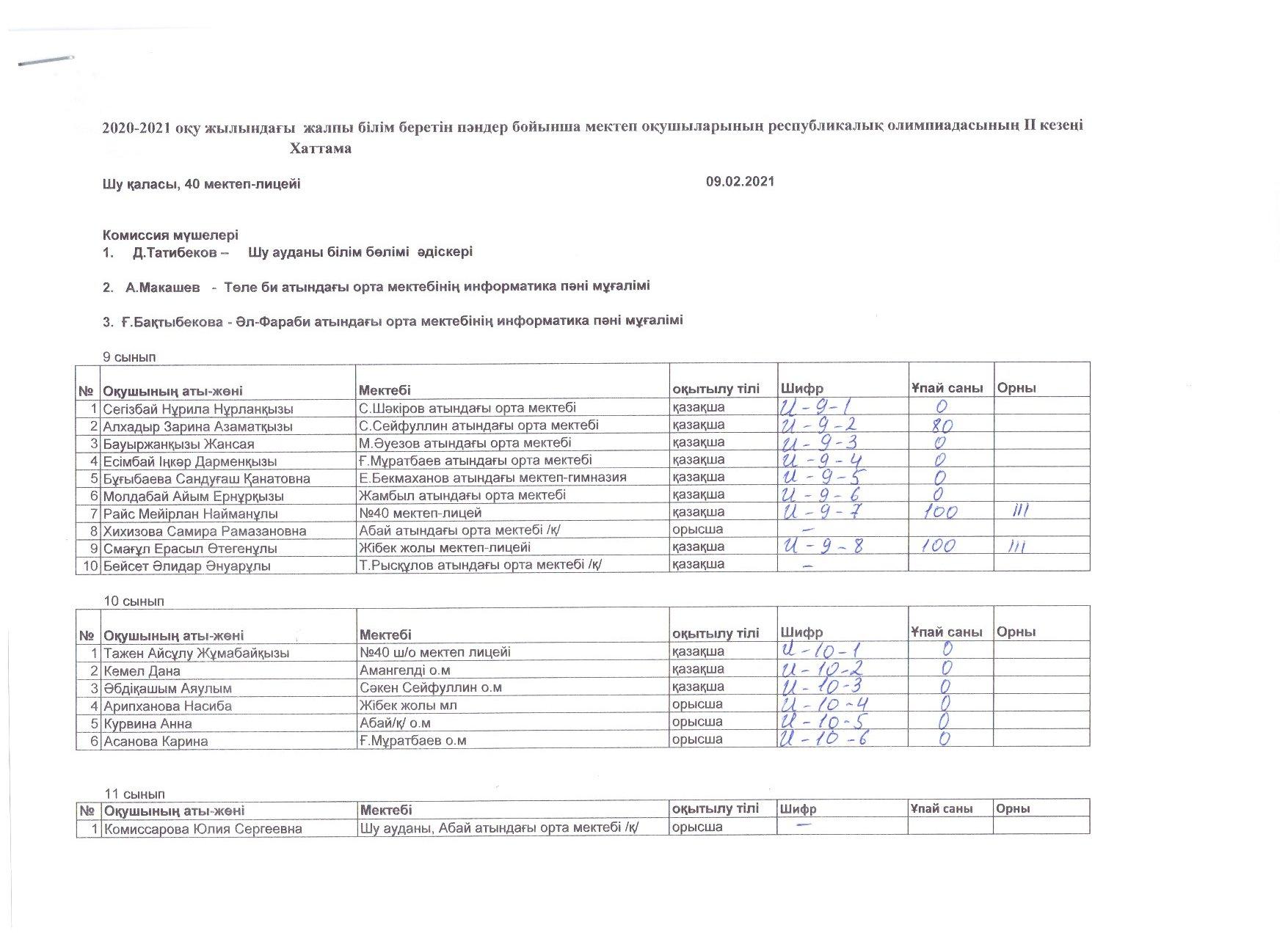 Жалпы білім беретін пәндер бойынша Республикалық олимпиаданың 2 (аудандық) кезеңінің Информатика пәні бойынша ХАТТАМАСЫ